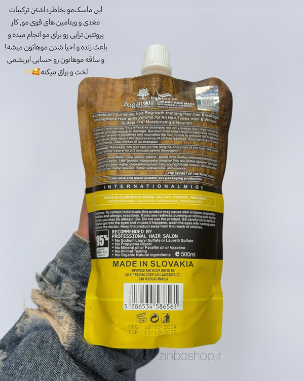 ماسک مو ارگان لایتنـ ـس این ماسکمو بخاطر داشتن ترکیبات مغذی و ویتامین های قوی مو کار پروتئین تراپی رو برای مو انجام میده و باعث زنده و احیا شدن موهاتون میشه و ساقه موهاتون رو حسابی ابریشمی لخت و براق میکنه •دارای ۹۵درصد روغن ارگان خالص مراکشی •ضد وزی و خشکی مو •ضد موخوره •بدون سولفات •حجم500ml •ساخت اسلواکی •با ضمانت اورجینال بودن محصول •(انقضا2027)